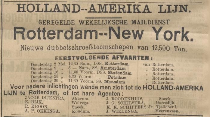 Die inlichtingen over de Holland Amerika Lijn zullen te krijgen zijn geweest in de drogisterij van Klaas Okkinga, in het pand dat nu Hoofdstraat 24 is. Het agentschap van de Holland Amerika Lijn is na het vertrek van Okkinga in 1924 naar Amerika overgenomen door neef Eeuwke Mensonides. Overigens: hoewel Klaas Okkinga in oktober 1924 naar Amerika vertrok, stonden nog tot en met december 1924 advertenties in de Leeuwarder Courant waarin staat dat informatie over de Holland Amerika Lijn ingewonnen kan worden bij K. Okkinga in Koudum.