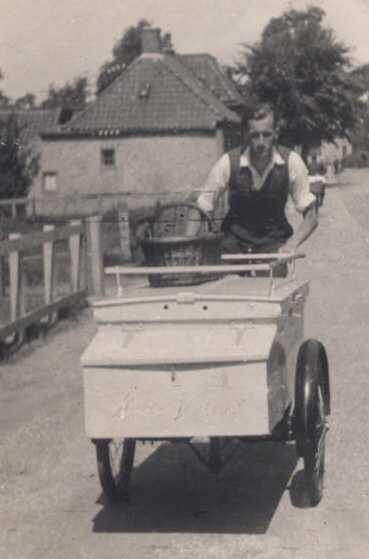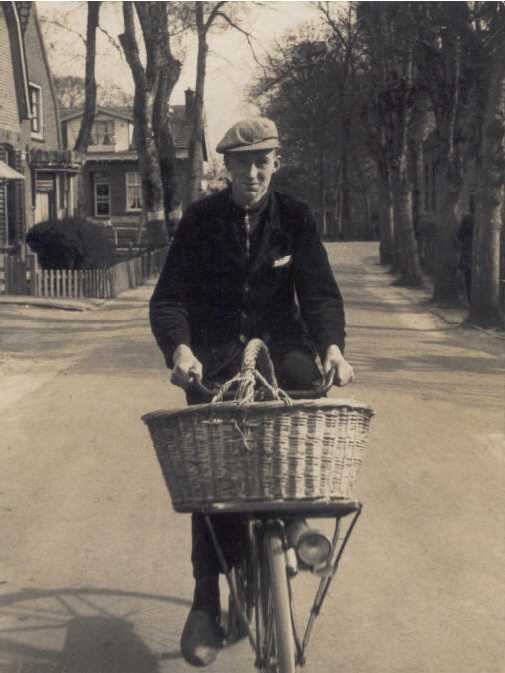 Klaas jr. heeft zijn hele bakkersleven gevent met een bakfiets of zoals hier met de transportfiets. Later kwam hij langs de deur met een bestelauto. De foto rechts is genomen in de Hoogstraat.